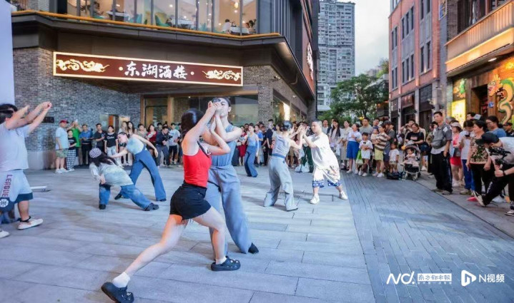 另一部作品《燃烧:在漫舞中前行》则是舞团2024年度力作,曾受邀赴荷兰诺德宗艺术节文化交流。作品融合非洲鼓点、电子音乐与“竞技场”“红毯秀”的视觉风格,舞者身着兼具运动功能与高级时装感的服饰,在永庆坊木棉广场空间自信行走、即兴漫舞。演出打破观演界限,强调“共创”与“玩趣”,通过互动与游戏感的设计,邀请观众在行走中感受个体的张扬与生命的搏动,形成一场兼具仪式感与娱乐性的城市艺术创作。