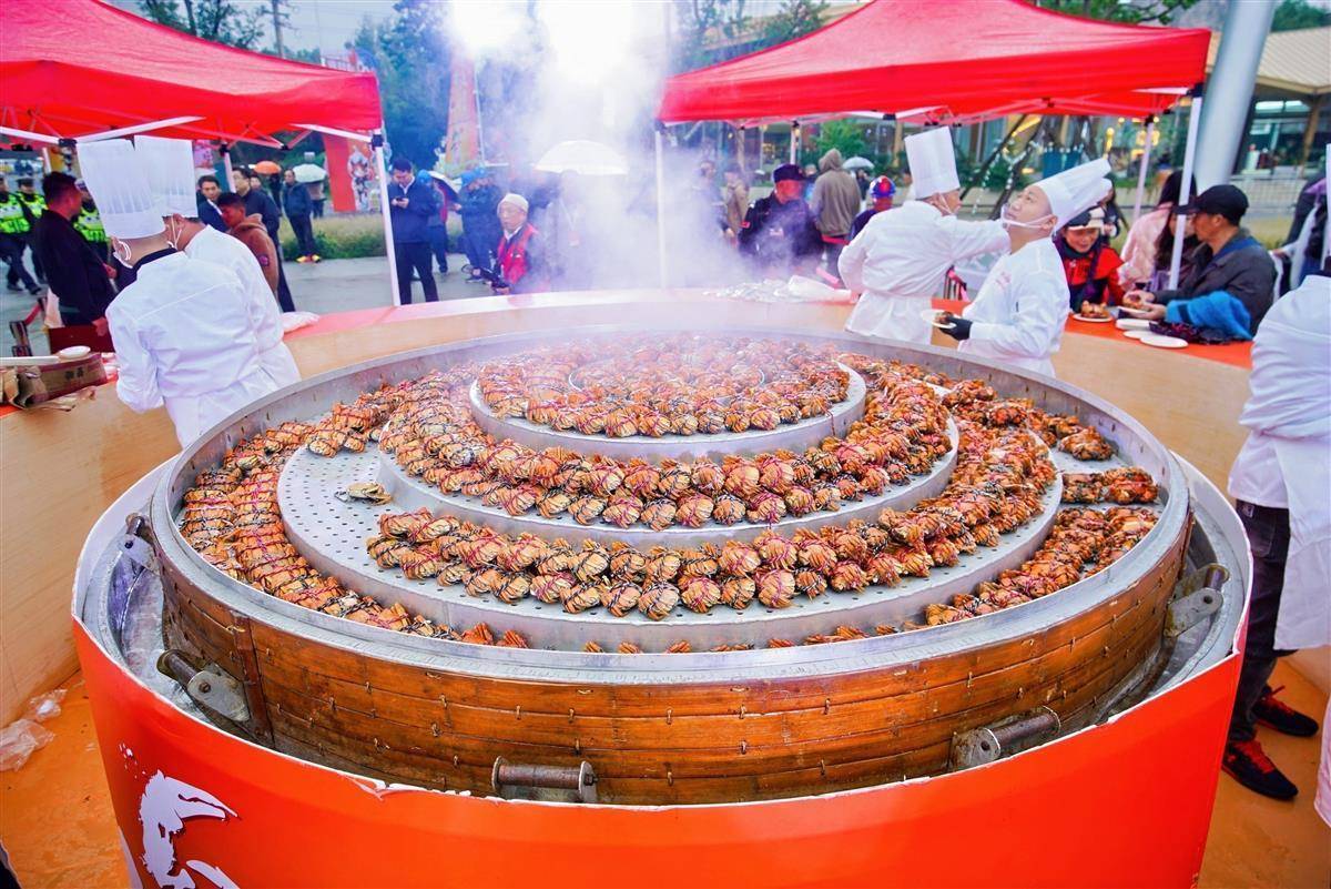 青壳白底金毛爪,个大肉鲜味道美。当晚,“万人品蟹”趣味宴在汉川市天屿湖旅游度假区热闹开席,随着直径2.8米的蒸笼被揭开,约1500只热气腾腾的螃蟹新鲜出炉。活动现场还设置了22个美食展位,推出香辣蟹、醉蟹等花式蟹肴及汉川特色小吃,吸引近2万名游客品尝。