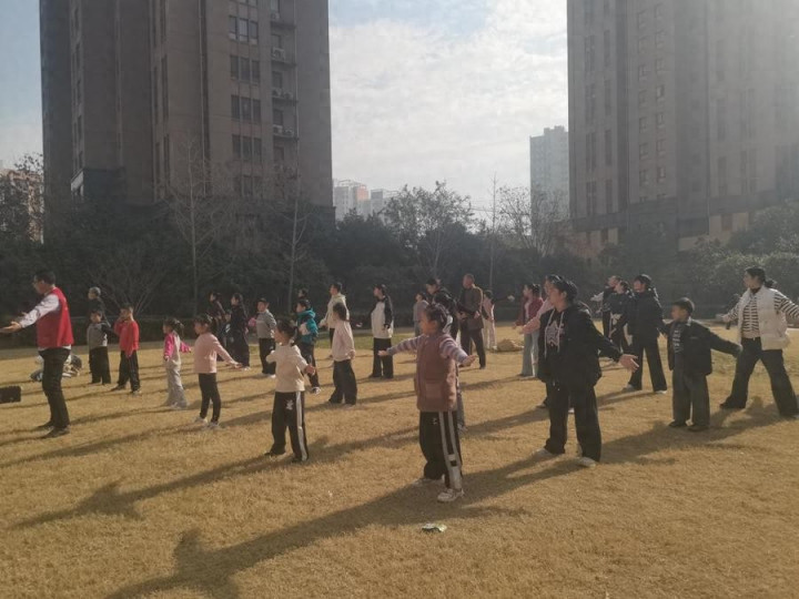 伴随着轻快的国风童谣版背景音乐,孩子们开始整合练习。从起势到收势,二十余道小小的身影动作逐渐整齐,原本有些拘谨的同学也放开了手脚,眼神里多了几分专注。不少家长在一旁观察,看到孩子挺直腰杆的样子,纷纷拿出手机拍照记录,有的还跟着后排悄悄模仿。