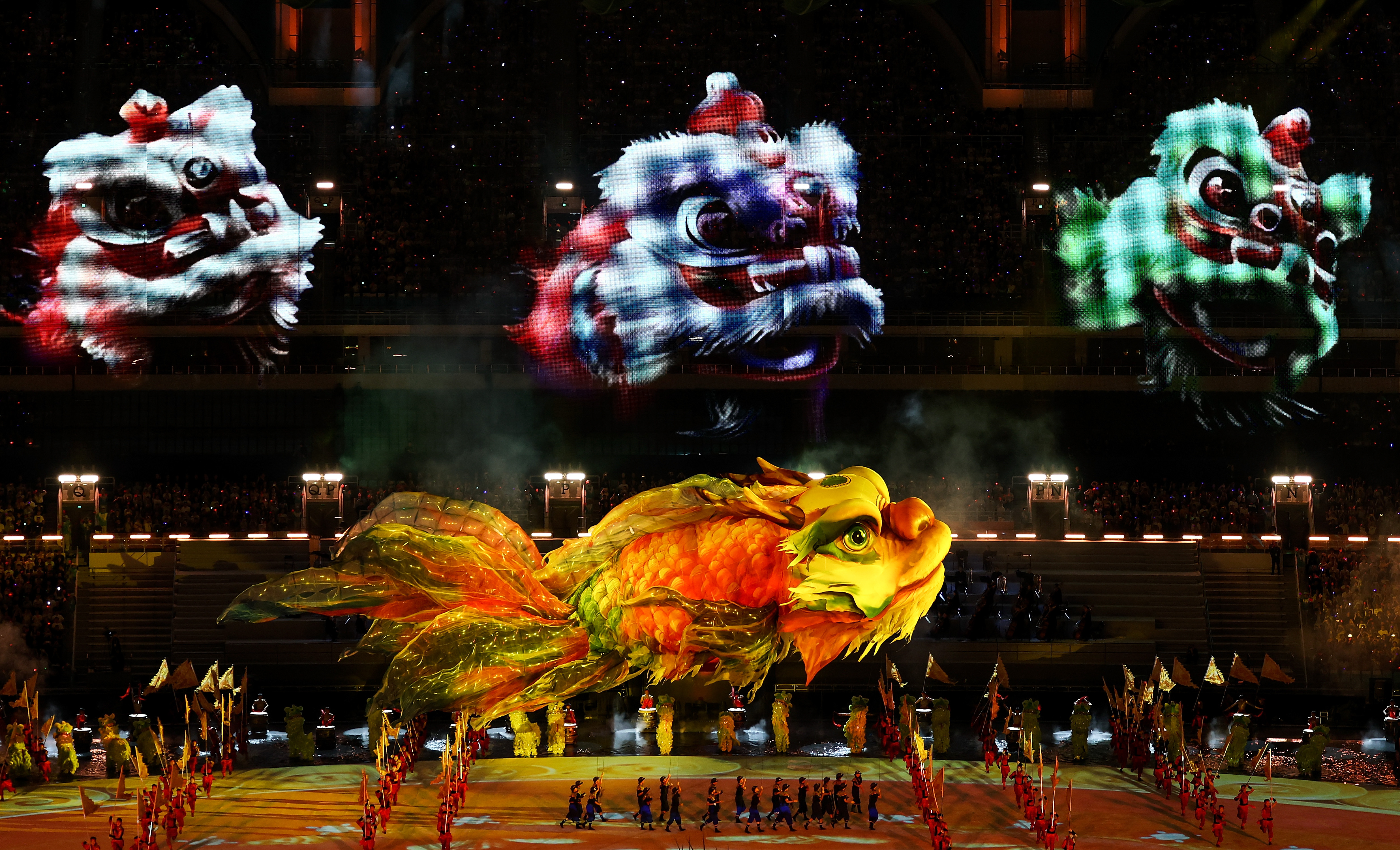 岭南“非遗宝库”的含金量彰显无遗。鳌鱼游弋、醒狮欢跃、武术刚健、粤剧婉转,开幕式尽显国际标准、中国气派、岭南风韵。以中华白海豚为原型的吉祥物“喜洋洋”“乐融融”成为顶流“大湾鸡”,全民调侃与“二创”折射市井温情与文化认同,“三国醒狮”盲盒一举成为销售冠军,传统文化在传承创新中迸发出新活力。