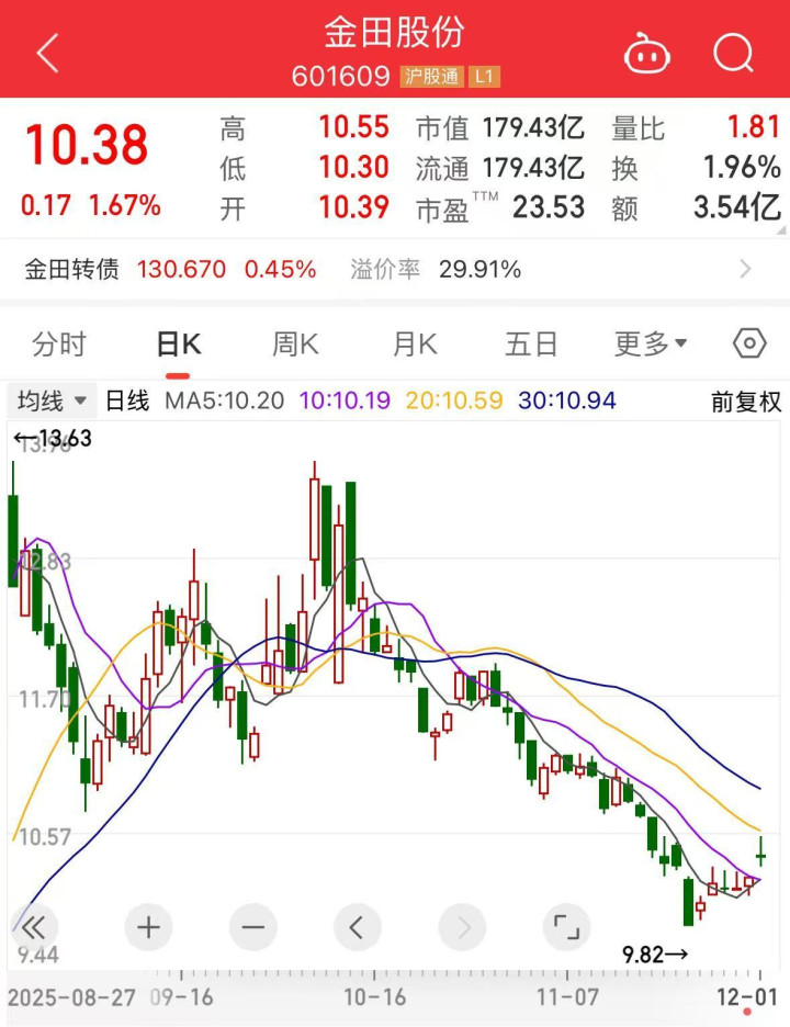 盘面上,截至今天收盘,金田股份涨1.67%,报10.38元/股,总市值179.43亿元。