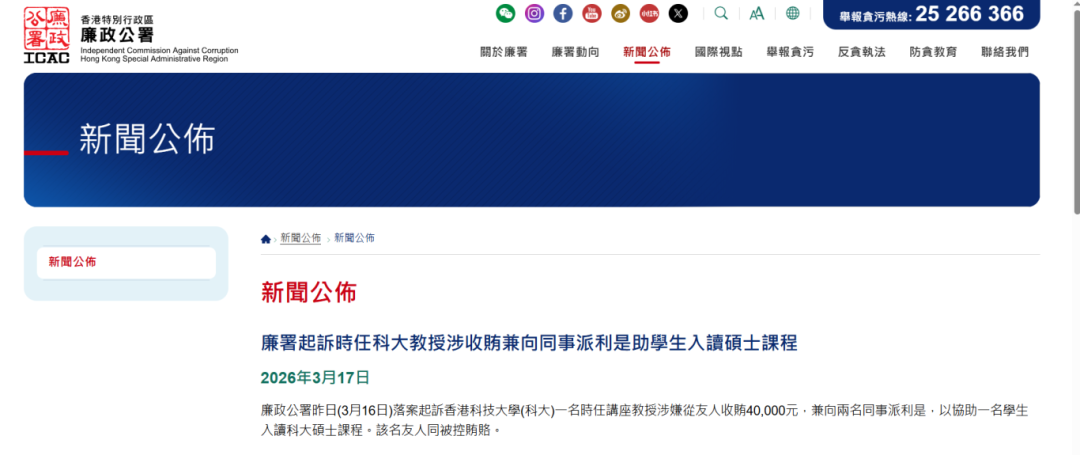 香港廉政公署3月16日起诉香港科技大学(简称“港科大”)一名前讲座教授,其涉嫌收受友人40000港元贿赂,兼向两名同事派利是(即“红包”),以协助一名学生入读港科大硕士课程。该名友人同被控贿赂罪。